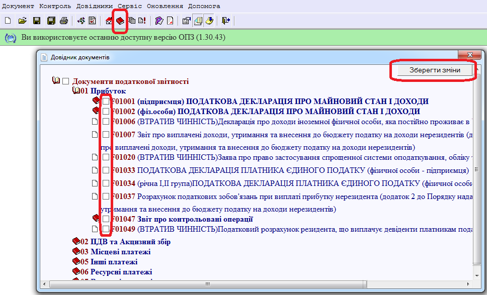 В "Справочнике документов" отметьте все необходимые формы отчетов и сохраните изменения