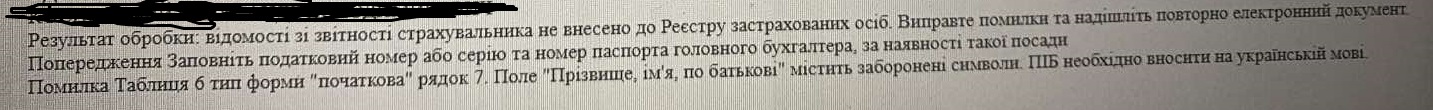 Не прошел отчёт По ЕСВ. Выдало код ошибки 09 "....Поле ПІБ містить заборонені символи."