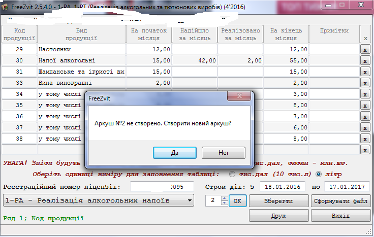 Код продукції можна обирати тільки з довідника, вручну вносити не можна. Поки не буде вказаний код продукції, кількість вносити теж не можна.