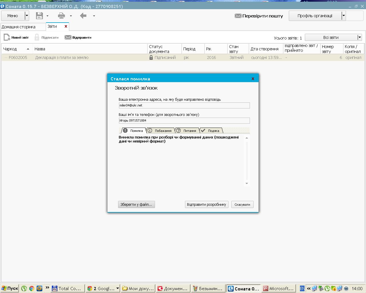 добрый день, Сегодня пробую сделать отчет податкової декларації плати за землю сформировал, импортировал, подписал, и когда отправляю пишет ошибку: посмотрите пожалуйста скидываю скрин, я просто не понимаю где может быть загвоздка