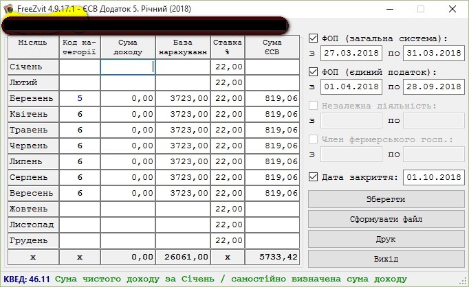 Практично коли роблю це в free zvit то формується звітність по ЄСВ ( додаток 5 + табл.2) для спрощеної системи, а потім лише можна створити окремо і для загальної системи . І що стосується загальної системи - то неможливо змінити базу нарахування. Вона автоматично проставляється з початку року. А ФОП зареєстрований тільки з липня місяця ( новостворений).