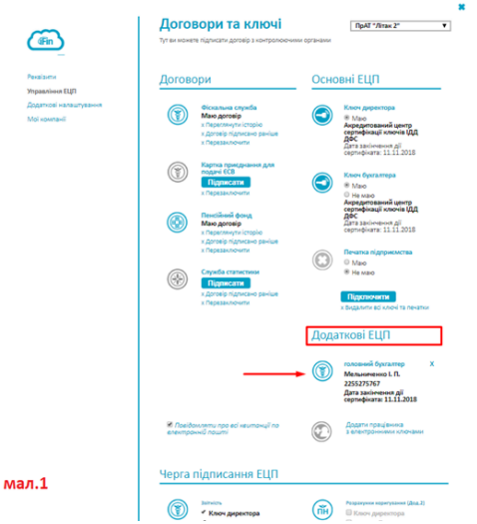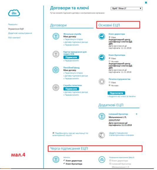 • У відповідь на надіслане «Повідомлення» протягом 10 хвилин очікуйте першу квитанцію від ДФС про те, що Звіт доставлено до контролюючого органу, протягом операційного дня очікуйте другу квитанцію від податкової. Якщо відповідь позитивна – Ваші нові ключі ЕЦП уже діючі і готові для роботи. Після цього новий ключ бухгалтера або іншого працівника завантажте у розділ «Основні ЕЦП» та налаштуйте «Чергу підписання ЕЦП» (див. – мал.4).