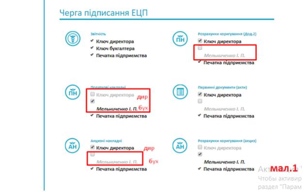 · якщо в основних ЕЦП у Вас підтягнуті 3 ключа (директор, бухгалтер та печатка), підписувати ПН/РК/АН/РК можна або ключем директора + печатка, або ключем бухгалтера + печатка, поставивши відповідні відмітки у «Черзі» (див. – мал.1);