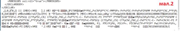 - звернути увагу, чи накладені підписи контрагента на АН / РК до АН, яку Вам необхідно зареєструвати. Для цього рекомендуємо завантажити файл АН на комп`ютер та відкрити за допомогою Блокнота. Якщо у його нижній частині є 1-2 абзаци суцільних «ієрогліфів» - підпис накладено (див. – мал. 2).
