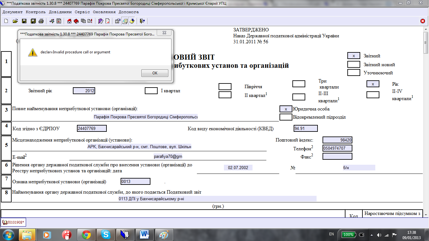 BUH0106 писал(а):Не получается сформиповать отчет -Податкову декларацію про використання коштів неприбуткових установ та організацій. Версия OPZ 1.30.8 Проблем при установке не было. Формирую отчет, выдает "deklar=Invalid procedure call or argument" а потом "Element content is incomplete according to the DTD/Schema. Expecting:HNAME", но обязательные поля заполнены, название предприятия - указано полностью и на украинском языке. Помогите понять в чем ошибка.