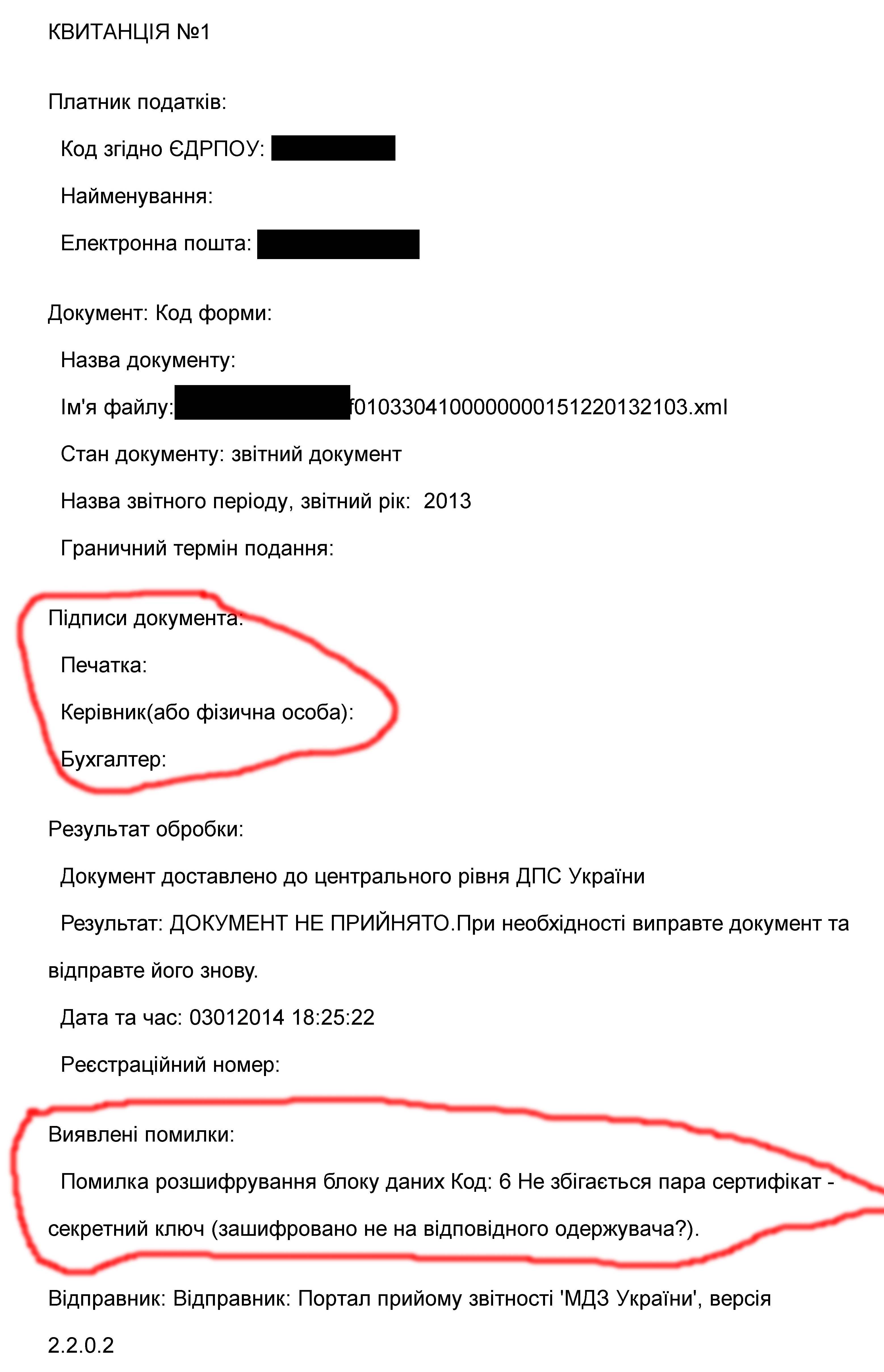 Добрий день! У мене теж така проблема: Квітанція 0 в загалі не розшифровується, квітанція 1 розшифровувається, але в ній зазначена помилка:НЕ ЗБІГАЄТЬСЯ ПАРА СЕРТИФІКАТ-СЕКРЕТНИЙ КЛЮЧ, а в частині "Підписи документа" взагалі не зазначено кім підписано документ, хоча при відправці звіту процедура підписання пройшла без помилок.