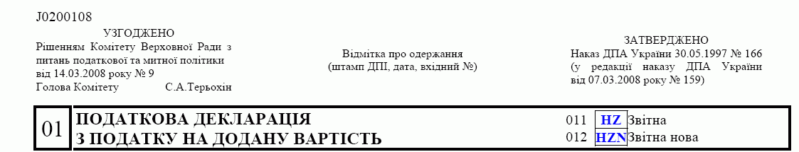 - у декларації з податку на додану вартість - "наказ ДПА України від 30.05.97 р. N 166 (у редакції наказу ДПА України від 17.03.08 р. N 159");