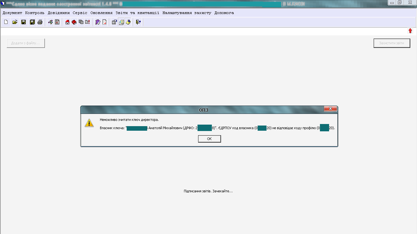 Если вы про сообщение "Деякі файли не вдалося додати через некоректний формат, або невідповідність коду організації: ..." при попытке "Додати з файлу..." в режиме "Підписати звіти" попробуйте http://rghost.ru/private/56374344/b10597e75ed24bb24f7bbd1ab0bd66af