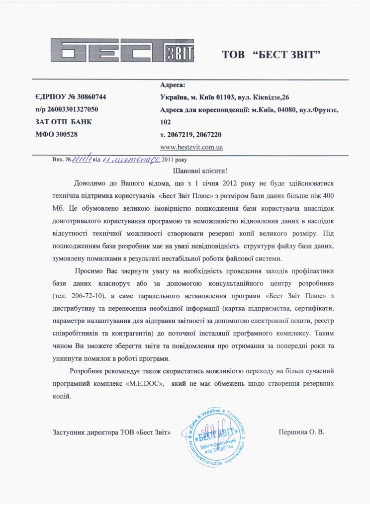 11-11-2011 Повідомлення для користувачів ПЗ Бест Звіт Плюс від Розробника